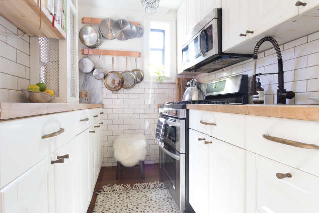 To share a mere 478-square-feet with another human has its challenges. But to share and successfully use only 38 square feet of kitchen space is even more impressive! There were many design dilemmas facing Ali and Chip when they purchased this small Brooklyn apartment three years ago, but none so mammoth as the task of making a teeny tiny kitchen work for two people who enjoy cooking. But they both deftly tackled the small and narrow space and have graciously shared all the details of how they did it themselves.