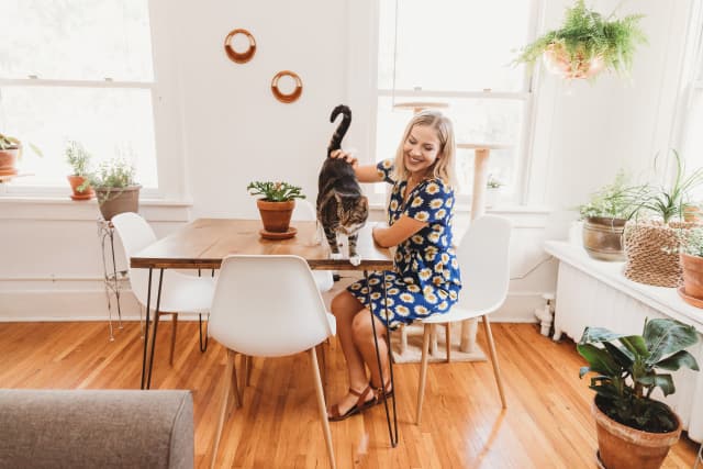 I moved to Colorado to attend graduate school, and hopefully I'll be here for awhile. I signed on the apartment before I saw it in person! I live here with my tabby Leo, who really loves to look out the windows and eat some of my plants. As soon as I moved in, we painted the walls and cabinets white. Then I arranged my furniture, covered the countertops in contact paper, built my desk and shelves, and filled the space with as many plants as possible. The apartment is about 750 square feet, which is perfect for me and Leo right now. Eventually, my boyfriend and I hope to move into a bigger place with a yard, but my little jungle home is an amazing place for me to study, work, and live.