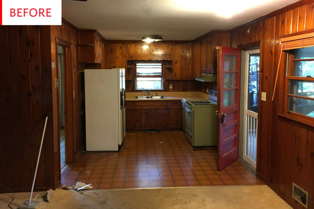 No matter how much one might love wood paneling and/or brown, this kitchen featured a little too much of both. Between the orangey brown, the above-sink scallop, and the avocado stove, this kitchen was a '70s triple threat—but not for long.