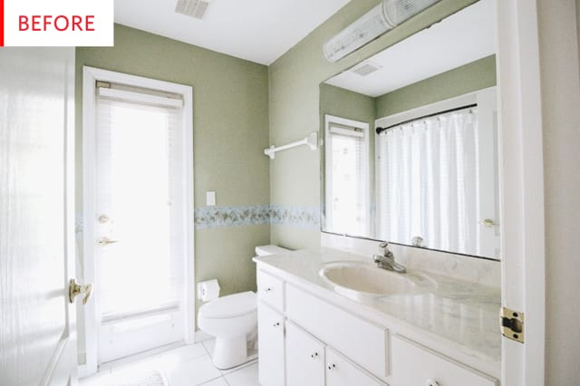 Although this guest bathroom had a lot going for it—spaciousness, tons of natural light, lots of counter space—it was also, in the words of its owner, "truly a flashback to 1993 in all its bathroom glory." The scalloped sink and peeled wallpaper had to go, so the entire bathroom got a 21st-century makeover.