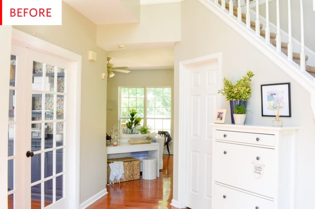 This entryway is pretty darn aspirational, but its owner knew it could be even better and was determined to improve upon the "standard, builder-grade finishes like the dreaded 'boob lights'" and the 20-year-old brown carpet on the stairs. Six weeks later, the stairway and entryway have a fresh new look.