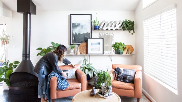 I am a Southern California native who is married to a lovely British man and we lived together in London for nearly a decade before moving back to Orange County a few years back. We went from a 400-square-foot flat in a busy city to more than double the space in a suburban townhouse. 900 square feet might seem small to a lot of people—but for us it seemed lavish when we first moved in! We have two outdoor spaces—where we have lots of my potted plants, real fruit and herb plants, and our outdoor fire pit. I am a huge lover of plants and we have over 40 plants inside the house, too! Much to my delight—this actually dictates a lot of the styling of the house!