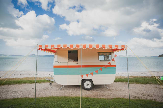 If you love the beach and cozy retreats, we've found the glamping getaway for you. This oh-so-quaint retro caravan set on the Pohutukawa Coast in Beachlands, Auckland, is available for rent and accommodates two.