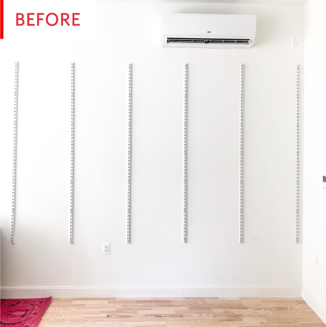 This unassuming bit of wall doesn't necessarily scream office built for two, but two desk chairs, eight shelves, and countless colors later, it is now a bright cheerful office suitable for two professional adults—and Rainbow Brite.